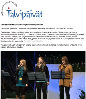 Den finskspråkiga pingströrelsen i Finland håller sina ledardagar (Talvipäivät = Vinterdagarna) i det nya mässcentret Lahti Halli i Lahtis 24-26.1.2013. Under tre dagar är drygt 700 ledare på plats och hundratals följer med programmet över webben där man kan välja allt mellan HD kvalitet på strömmingen och för lägre bandbredd lägre kvalitet på videon eller bara audio. På det här sättet ger man möjlighet förutom för ledare i Finland, även missionärer och andra utlandsarbetare att delta i konferensen. Väl organiserat och tekniskt professionellt avtryck av konferensen.