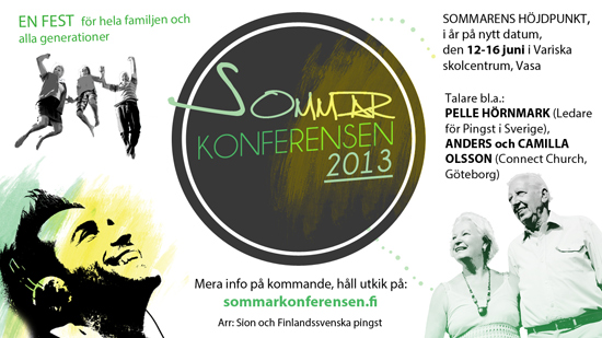 Sommarkonferensen i Vasa börjar i morgon. Ledare från de finlandssvenska pingstförsamlingarna samlas för samtal på torsdag morgon och på fredag – lördag blir det program även dagstid för alla intresserade. Kvällsmötena börjar på onsdag kväll kl. 19 och fortsätter till lördag. Konferensen avslutas på söndag med gudstjänst kl. 11. Här på pingstfi-bloggen kommer det att finnas referat från konferensen allt eftersom dagarna går…