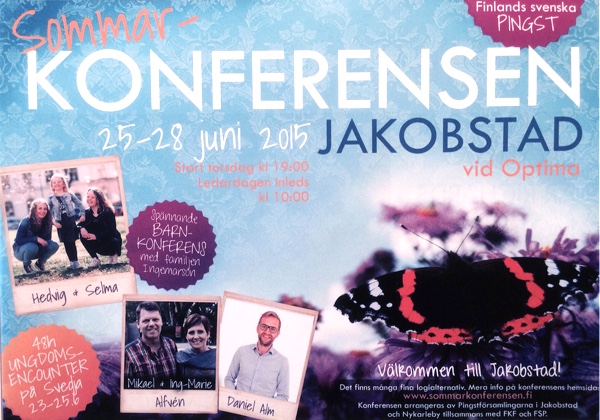 Den 25-28 juni ordnas den årliga sommarkonferensen i Jakobstad. Konferensplatsen blir vid Optimas lokaler i centrum av staden. Det blir ett mångsidigt program för alla åldrar och varm gemenskap då du träffar människor från Svenskfinlands alla hörn.