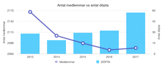 Om man drar en snabb slutsats av grafen så ser man att år 2017 var dopsiffrorna nästan dubbelt större än under flera föregående år. Ökningen var så pass stor att rörelsen kan notera en liten nettoökning i totalt medlemsantal. Det här bryter den nedåtgående trenden i medlemsutvecklingen som pågått under flera år och år 2017 kan därför sägas vara ett exceptionellt år.