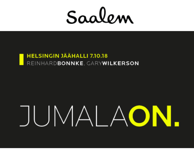 jum_on18.650Saalemförsamlingen i Helsingfors fyller 90 år och firar med stort evenemang i Ishallen. Huvudtalare är Gary Wilkerson och Reinhard Bonnke. Evenemanget heter JUMALA ON. och du kan ta en titt på webbsajten som Saalem lagt upp om saken. Reinhard Bonnke är en evangelist som samlat miljontals människor till kampanjer särskilt i Afrika och som besökt Finland flera gånger förut. Gary Wilkerson är son till David Wilkerson, och leder nu World Challenge.