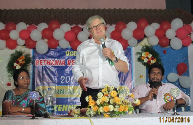 Bilden från samling i Indien, en av de många internationella samarbeten som Kenneth varit med och startat och/eller utvecklat. Kenneth här tillsammans med Nalini Winston och Emmanuel Winston, ledare för UCCI som driver församlingsarbete, skolor, kliniker mm.