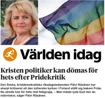 Den tidigare inrikesministern, nuvarande medlemmen i Finlands riksdag, Päivi Räsänen, har blivit föremål för polisutredning och åtalsprövning. Läs mer om det t.ex. i Världen idag (bilden).