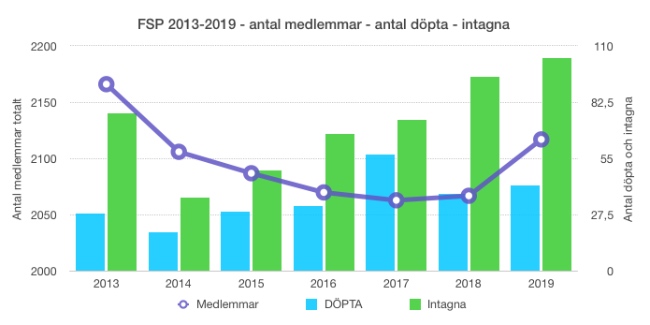 Totalt ökade det sammantagna medlemsantalet för FSP med 45 personer till 2117 (2018: +4, 2072). 104 (95) personer intogs, medan 59 (91) avfördes. Av de 27 församlingar som noteras i FSP kunde 11 församlingar notera en ökning, 9 församlingar hade ingen förändring att rapportera, medan 7 församlingar minskade.