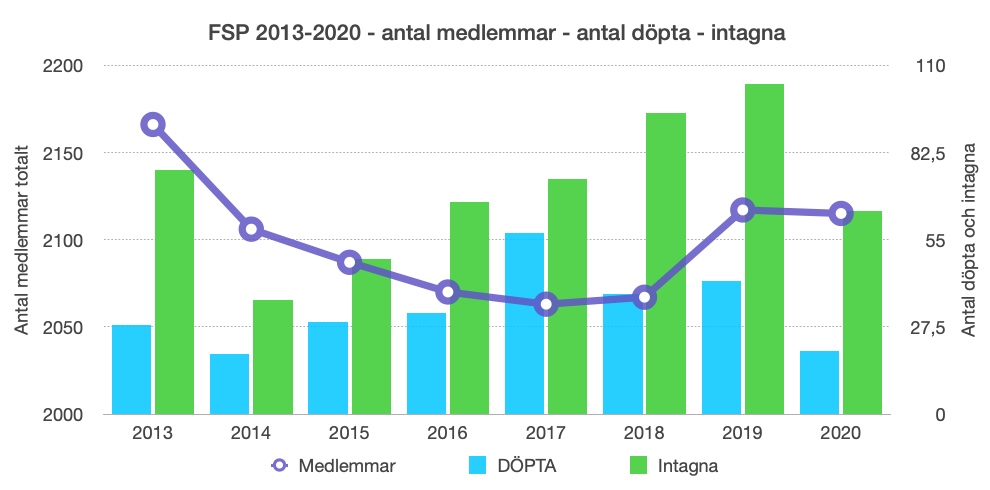 Av de 27 församlingar som räknas in i FSP:s nätverk har 7 församlingar noterat en ökning, 14 församlingar bokför en minskning och resterande 6 har oförändrat medlemsantal. Endast 8 församlingar har döpt och ytterligare 4 har tagit emot på flyttningsbetyg/bekännelse. Det betyder att 15 församlingar inte har välkomnat en enda medlem under 2020. 19 församlingar har avfört medlemmar (avlidna, utflyttade).