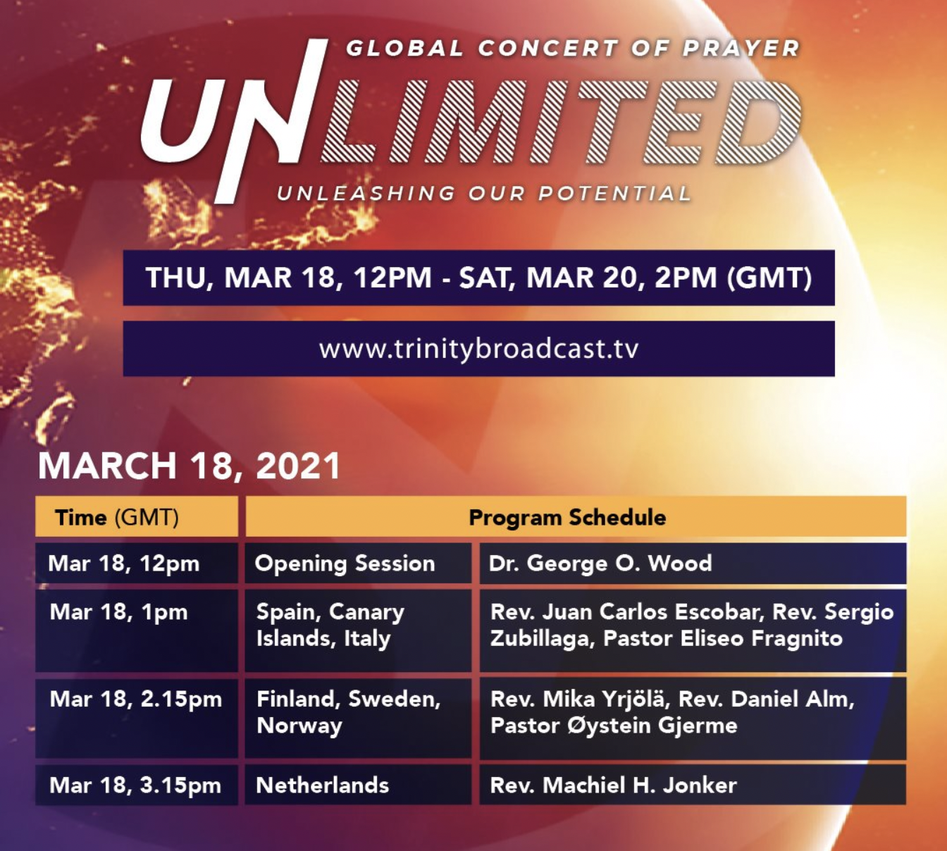Det är mycket bön i församlingarna just nu. Det arrangeras bl.a. ett stort – globalt – böne-evenemang under 18-20 mars 2021, kallat ”Global Concert of Prayer”. Det är World Assemblies of God Fellowship som uppmanar till tre dagar av bön tillsammans över nätet. Det sänds live från www.trinitybroadcast.tv och under den första dagen är även nordiska pingstledare med: Daniel Alm (Sverige), Mika Yrjölä (Finland) och Øystein Gjerme (Norge) är med och leder den internationella gemenskapen i bön. Men sedan är det pastorer och evangelister från alla världens hörn som medverkar. Lyckligtvis går allt på engelska. Bönesatsningen börjar torsdag 18.3 kl. 12 GMT, dvs kl. 13 svensk och kl. 14 finsk tid. Den internationella bönesamlingen pågår sedan nonstop till kl. 16 på lördag 20.3. Öppet för alla som vill vara med. Du får samtidigt ett smakprov på hur den internationella pingstkyrkan ser ut och låter…