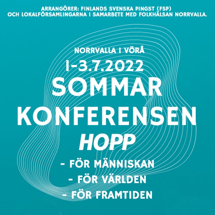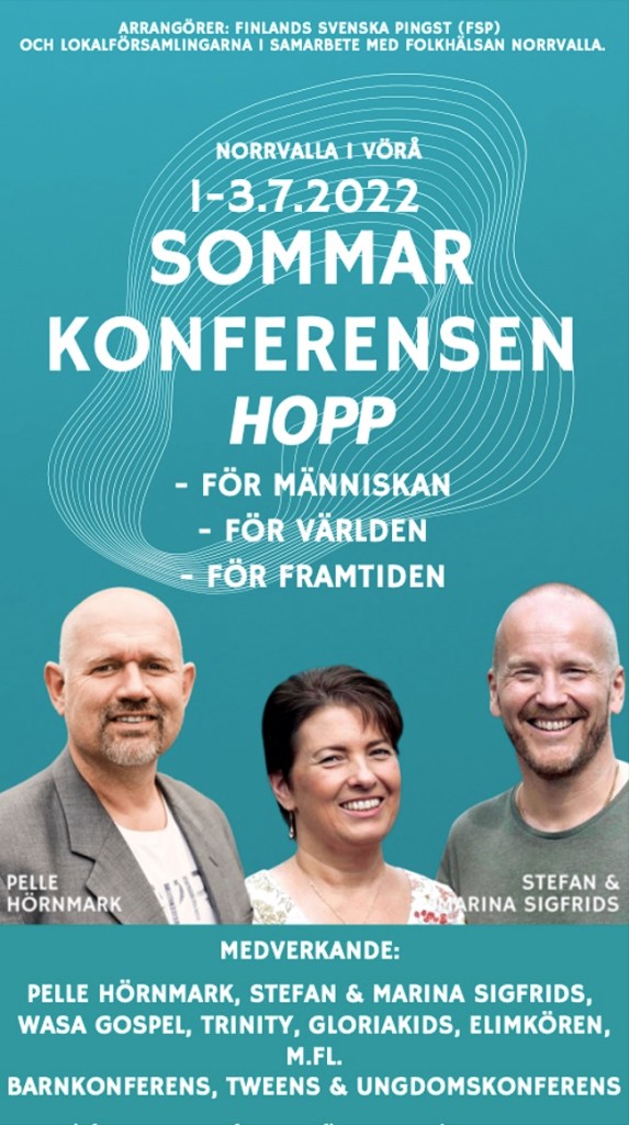 Välkommen på Sommarkonferens till Norrvalla i natursköna Vörå. Det är några år sedan vi senast möttes till konferens och det skall bli en stor glädje att få samlas kring temat HOPP och ta del av god undervisning, sång och musik, lovsång och gemenskap.