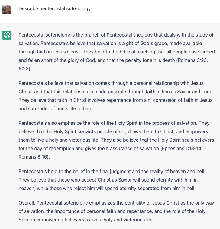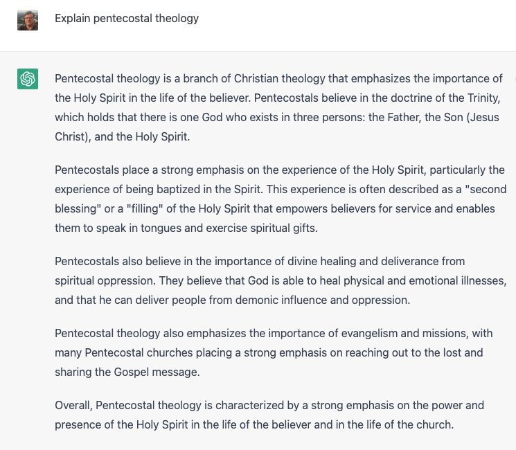 Blev nyfiken på vad chatboten OpenAI GPT-4 möjligen kunde skriva ihop om pingst, så jag ställde ett par frågor. Jag fick kortfattade svar, men visst var det helt igenkännbara beskrivningar av pentekostal teologi och pentekostal frälsningslära. GPT-4 kan nog bli ett intressant och, varför inte, användbart verktyg, lite som wikipedia på steroider. Men källgranskning är ju obefintlig så håll i hatten. Men kul att testa på ändå. Här nedan vad chatboten svarade: