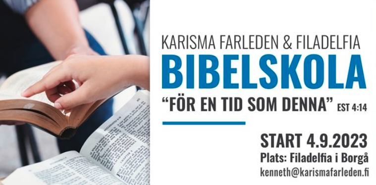 Hösten 2023 startar en bibelskola i Östnyland. Kenneth och Elisabeth Witick, som arbetar i Filadelfiaförsamlingen i Borgå, inbjuder den som vill lära sig mer om Bibeln och dess budskap att vara med på bibelskolan ”För en tid som denna” (hänvisning till Esters bok 4:14). Bibelskolan, som hålls i Filadelfiakyrkan i Borgå, startar den 4 september 2023, pågår alla vardagar kl. 9-13 och kostar 50€/vecka. Dessutom kommer det att serveras morgonmål, kaffe och lunch på plats för en billig avgift.