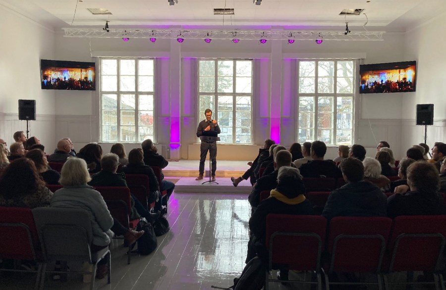 Bilden: Redan i mars 2023 fick pingstförsamlingarnas ledarkonferens en liten förhandstitt på byggnaden. Projektledare Mikael Nylund berättade om hur projektet framskridit (foto Oskar Sjöberg).