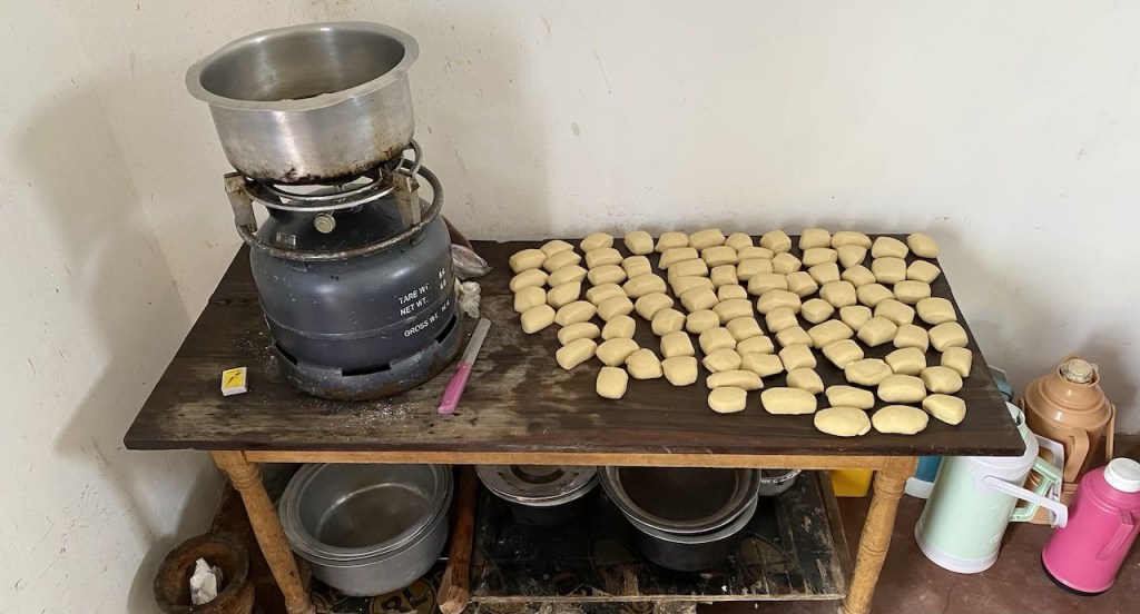 Vi (Maisha bora-projektets personal och jag) besökte igår en mamma som har fem barn, mannen har övergett henne och familjen ger inget stöd, snarare tvärtom. Själv är hon partiellt synskadad, av hennes fem barn är fyra synskadade. Trots det svåra utgångsläget var det en glad och energisk dam vi mötte, som driver en blomstrande verksamhet med att servera mat (ris och chapati) och sälja friterade munkar. Hon har fått hjälp av projektet Maisha bora för att skaffa lite mer förnödenheter och utöka verksamheten.