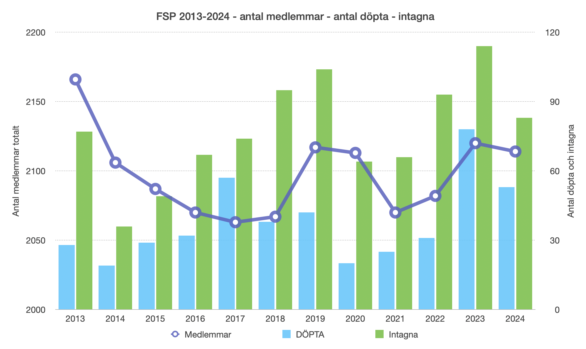 I tabellen som sträcker sig från 2013 till 2024 ser man en tydlig svacka i medlemsutvecklingen under covid-åren. De senaste tre åren har medlemsstatistiken ”normaliserats”. Under 2024 tog församlingarna emot 83 nya medlemmar. Samtidigt avförde man (döda och utflyttade) 86 personer. Nettominskningen blev 6 personer, jämfört med rapporterade siffror för 2023 (ingår några korrigeringar).