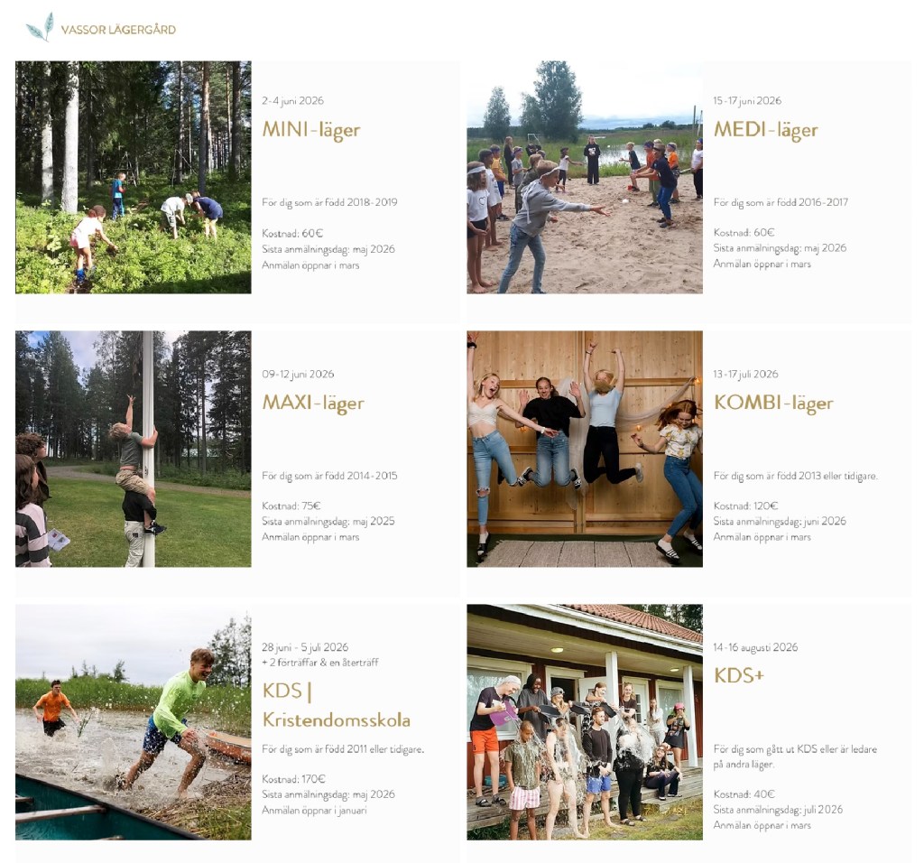 Som du ser av bilden nedan finns det läger för alla åldrar. Läs mer om de olika lägren på Vassor lägergårds hemsida.