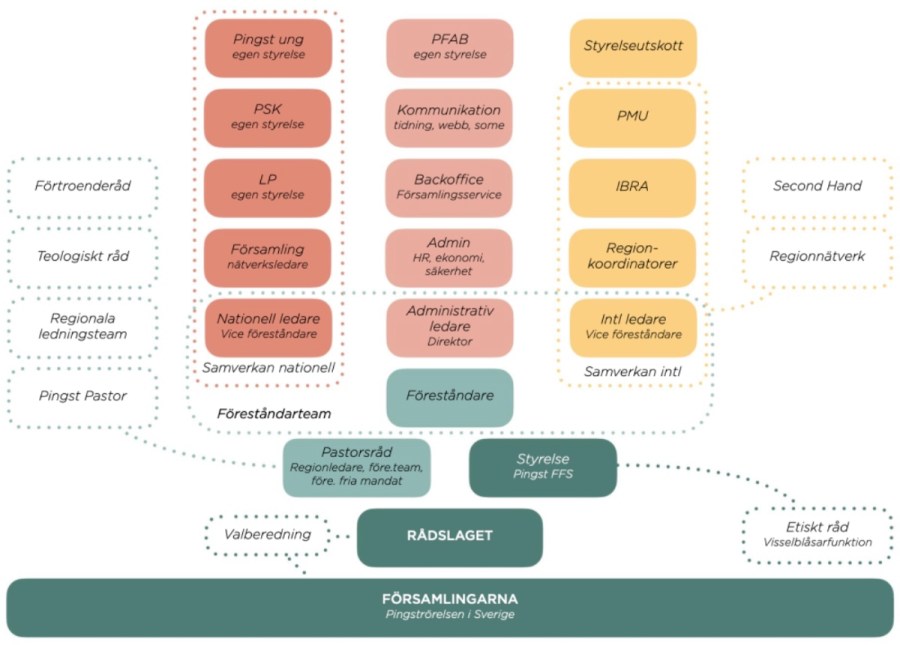 Ledarteamet kommer att bl.a. ha ett pastorsråd som stöd. Och sedan har den mångfacetterade verksamheten inom Pingst FFS en drös med ansvariga ledare. I dokumentet ”Pingströrelsen och framtiden” presenteras organisationen med en bild (nedan) som visar mångfalden.
