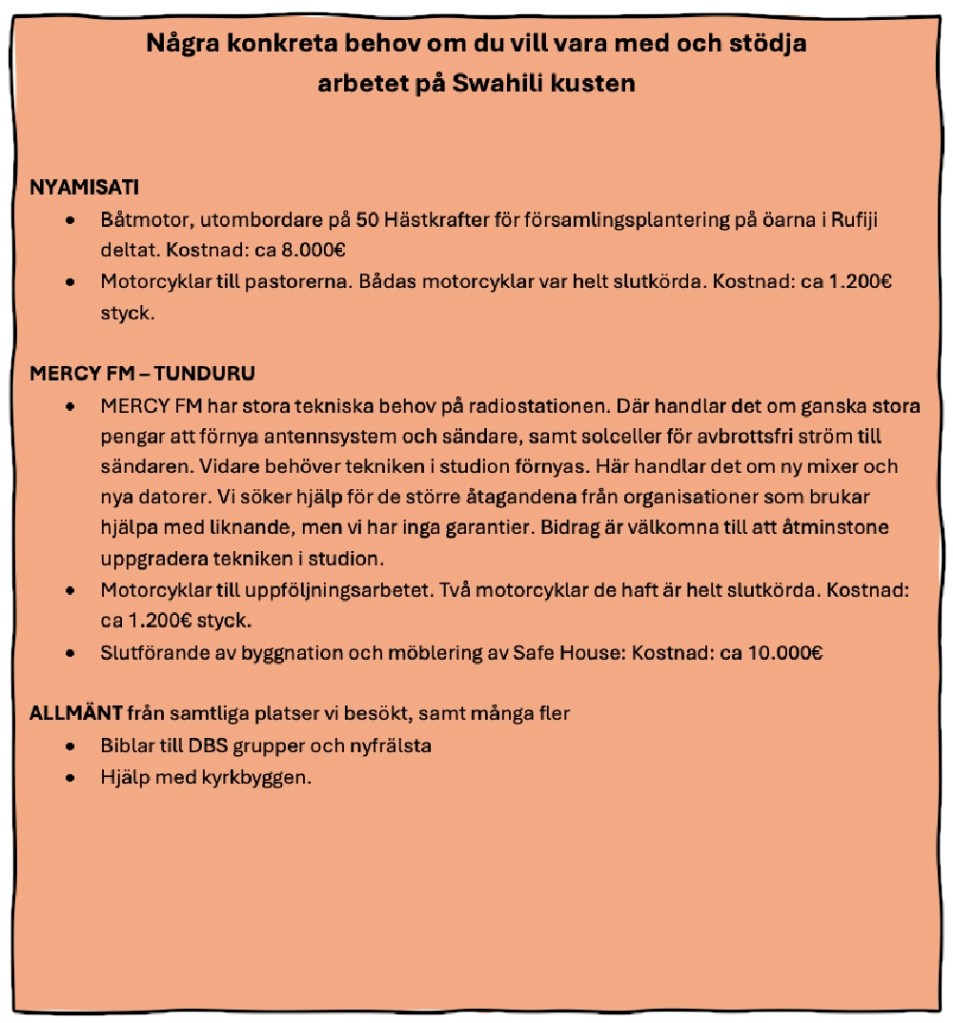 Vi konstaterar att arbetarna behöver mycket uppmuntran och stöd samt fortsatt vägledning och coachning. Vi hoppas att vi kunnat bidra med en del av det under vår resa. Vikten av arbetet på Swahili kusten blev ännu tydligare, och våra hjärtan greps ännu starkare av en bön och önskan att se Guds rike få gå fram med kraft på platser där Jesus ännu inte är känd.