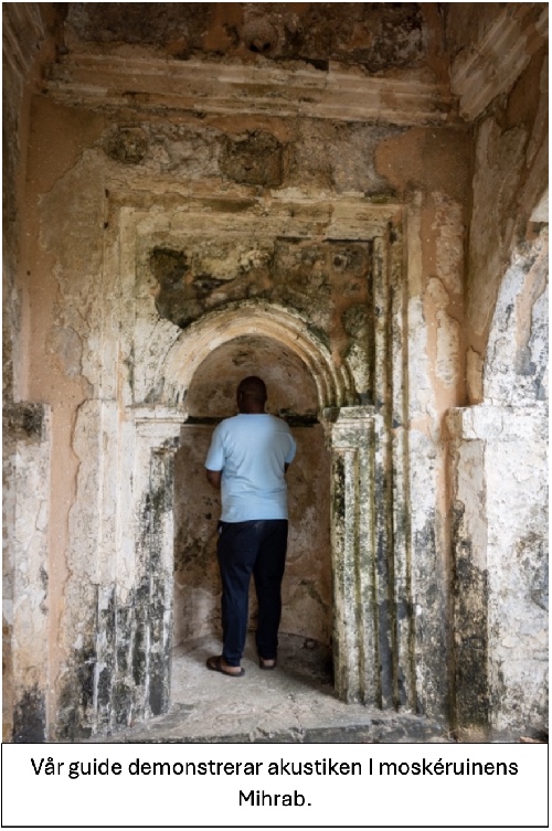 Vi gjorde ett besök i Kilwa Kisiwani efter söndagens gudstjänst i Kilwa Masoko där jag hade förmånen att predika. Den väl påläste guiden Dula som är uppvuxen på ön visade oss runt och berättade om ruinerna och Kilwas historia. Det stora Sultan palatset Husuni Kubwa (Den stora sorgen) som byggdes på 1300-talet ser man konturerna av fortfarande. Några tjocka korallstenväggar står kvar. Kilwas stora moské dateras ända tillbaka till 1100-talet med en nyare del byggd på 1300-talet. Det är en av Östafrikas äldsta bevarade moskéer. Portugisernas delvis raserade fort återuppbyggdes tidigt 1800-tal av Oman araberna. På grund av sina väl bevarade ruiner fick Kilwa Kisiwani status som UNESCO World Heritage Site år 1981.