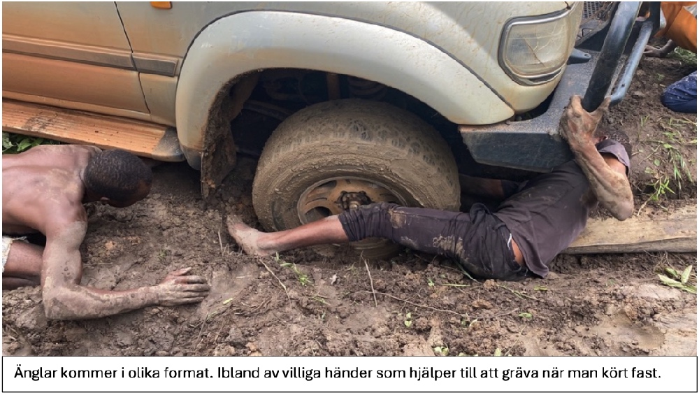 Änglar kommer i olika format. Ibland av villiga händer som hjälper till att gräva när man kört fast. Lokala män kom för att se på eländet. De var snabba att hämta hackor och bräder i hyddorna runtomkring och satte igång att gräva. Det tog oss två timmar att få loss bilarna trots att två team jobbade parallellt med båda bilarna samtidigt. När vi äntligen kom loss var det så gott som mörkt och vi visste att vi ännu hade ca 70 km till Tunduru på vägar som hade fått mera regn sedan vi kom. Till den lokala pastorns besvikelse blev vi tvungna att säga till honom att än om kyrkan nu var inom gångavstånd kunde vi inte ta oss tid att komma dit. Vi bad honom hälsa så hjärtligt till dem som eventuellt ännu väntade i kyrkan. De män som varit mest ihärdiga att gräva loss bilarna fick en slant som tack.