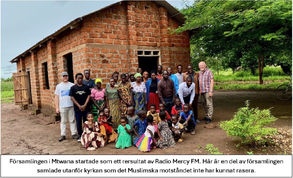 Församlingen i Mtwana startade som ett rersultat av Radio Mercy FM. Här är en del av församlingen samlade utanför kyrkan som det muslimska motståndet inte har kunnat rasera. Victor och medlemmarna blev ännu mer beslutsamma efter att de hört detta. ”Nu måste vi till varje pris bygga upp kyrkan på nytt. Större och bättre.” Efter några veckor stod kyrkan där igen. Med tiden har både muslimledarna och byledningen kommit att acceptera att det nu finns en kyrka i byn.