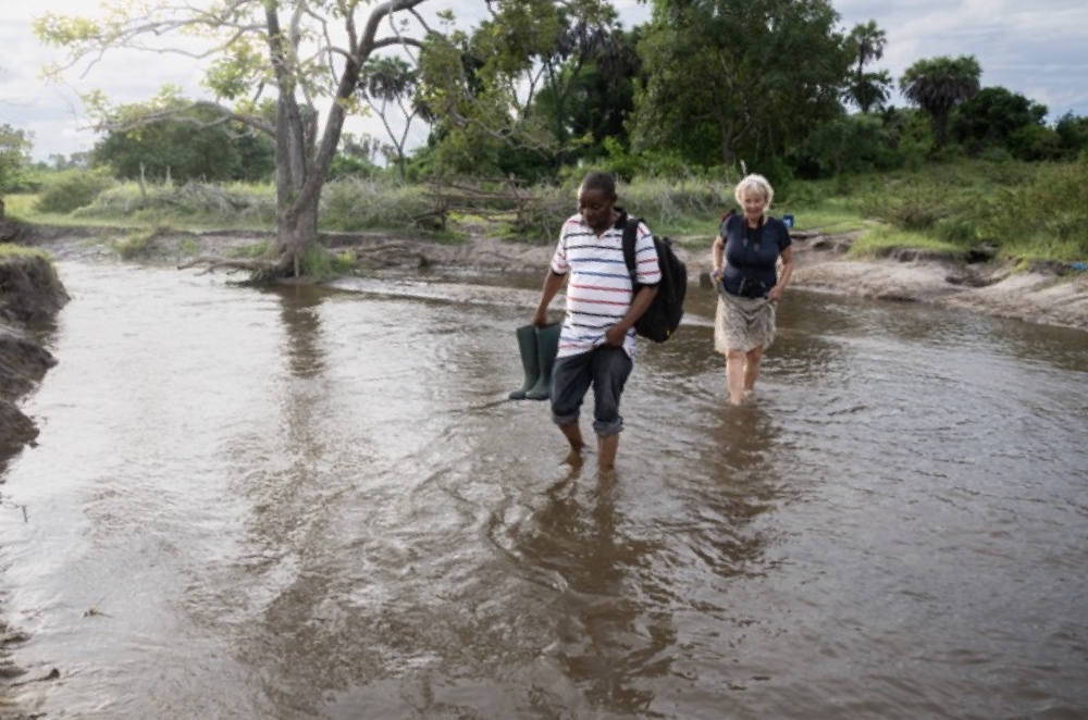 Pastorerna körde före på motorcykel och vi följde efter med vår bil. Efter 10-12 km svängde de av vägen och körde in på en liten väg som snabbt avsmalnade till en stig. De smet enkelt mellan buskarna med sin motorcykel, medan vi fick söka omvägar för att hitta tillräckligt utrymme för vår bil. Vi kom fram till en liten flod där det inte fanns möjlighet att ta sig över med bilen. Vi måste lämna både bil och motorcykel vid flodkanten. Nu var det inte så mycket vatten i floden trots en del regn. John berättade att mot slutet av regntiden fylls floden och hela slätten där bilen nu stod. Vattnet blir då så strömt att det är farligt att försöka ta sig över för vattnet kan gå upp till bröstet.