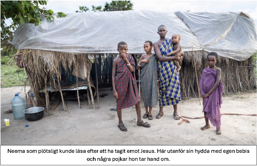 Neema berättar att hon aldrig gått i skola, men alltid varit vetgirig och nyfiken. När hon tog emot Jesus kunde hon plötsligt läsa. När Noa och John kom till deras boplats för att upptäcka Bibeln tillsammans, blev hon fascinerad av det hon hörde om Jesus. Hon var först bland vännerna att ta emot Jesus. En dag bad hon att få titta i Bibeln. Plötsligt, från ingenstans, fattade hon hur det fungerar med att läsa. Hon började läsa Bibeln. Först lite långsamt och trevande, men snart helt flytande. Hon skiner som en sol när hon berättar hur Jesus lärde henne läsa. Nu lär hon dom andra kvinnorna att läsa. Vetgirig som hon är, vill hon nu lära sig engelska. För de få små slantar hon och hennes man får ihop från åkrar och boskap har hon köpt några engelska läroböcker som hon studerar på egen hand. Hon testar ivrigt sina begynnande språkkunskaper på oss. Hon är en självklar ledare för bibelupptäckargrupperna som nu finns i grannskapet och är på väg att en församling.